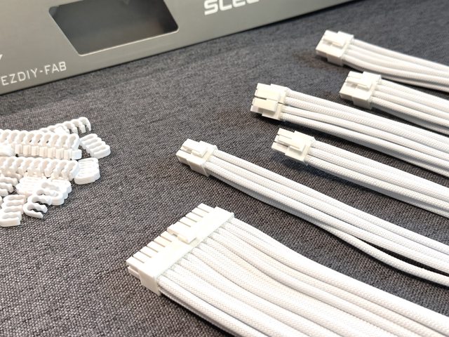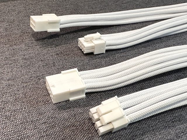 全白編織延長線以套件方式販售,共有主機板24P一條、CPU4+4P1條、PCI-E 6P兩條、