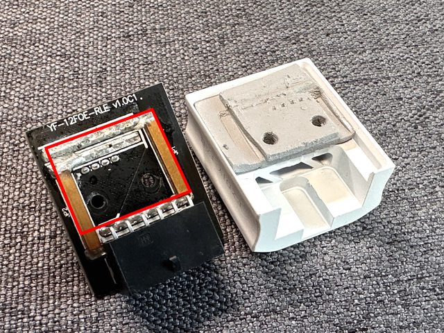 正面外殼導熱墊採用大小兩片相疊以覆蓋金屬導體及焊接位置,但導體有部分未覆蓋到。