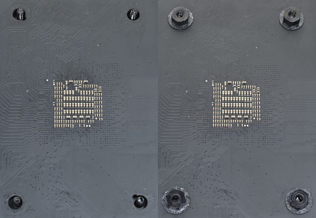 ▼用手扶著散熱器把主機板翻過來,確認主機板背面散熱器孔位露出4支高度相同的螺柱(