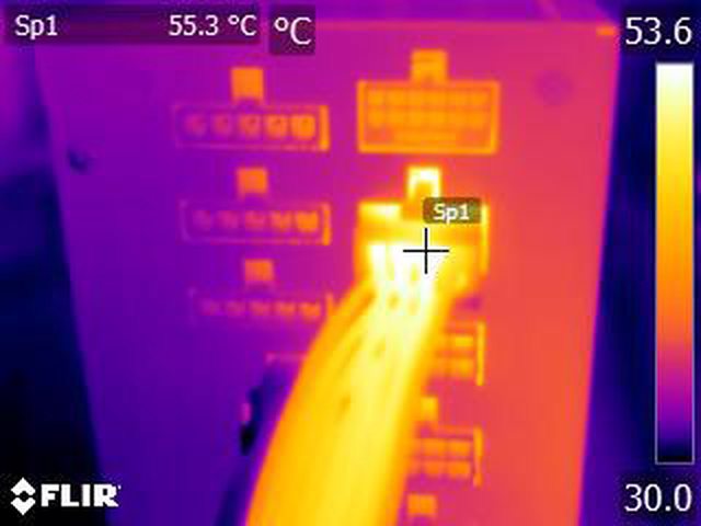 ▼執行FURMARK 30分鐘後電源端插頭的紅外線熱影像圖(附註:安裝位置環境溫度會影響