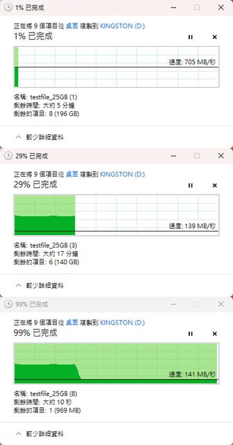 在30%(60GB)處降速到139MB/s,結束前速度141MB/s