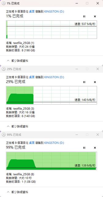 在30%(60GB)處降速到140MB/s,結束前速度139MB/s