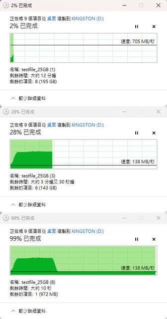 始速度705MB/s,約在28%(57GB)處降速到138MB/s,結束前速度138MB/s