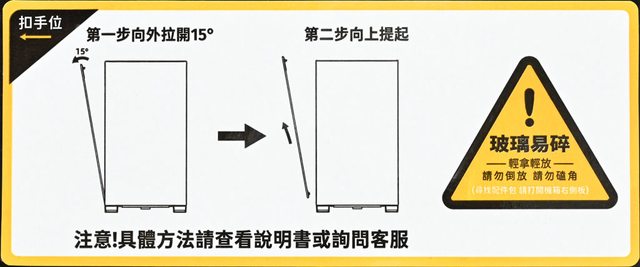 ▼出貨時會在左側強化玻璃的保護膜貼上側板開啟方式及玻璃易碎注意貼紙