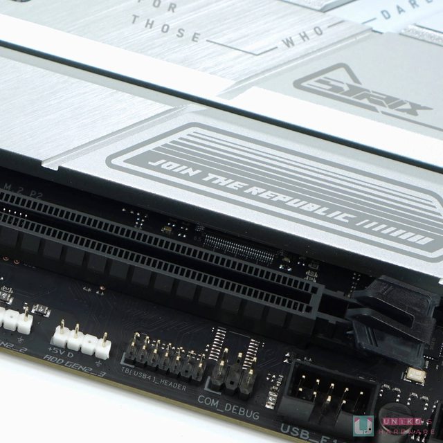 Q-DIMM 設計在上方設有單邊扣,雖然華碩已為上方的針腳 CPU_OV 3-PIN,和 AIO_PUMP 4-
