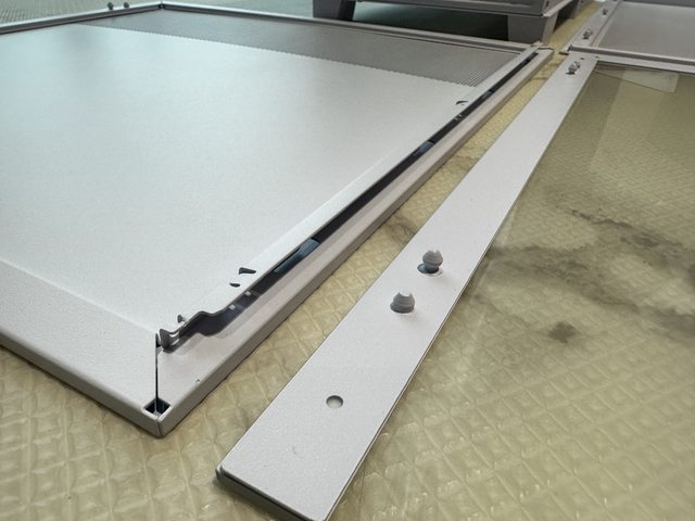 玻璃側板周圍有一圈強化結構用鋼材,各側板皆採用上方球型卡扣、下方彎折卡槽方式固