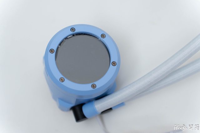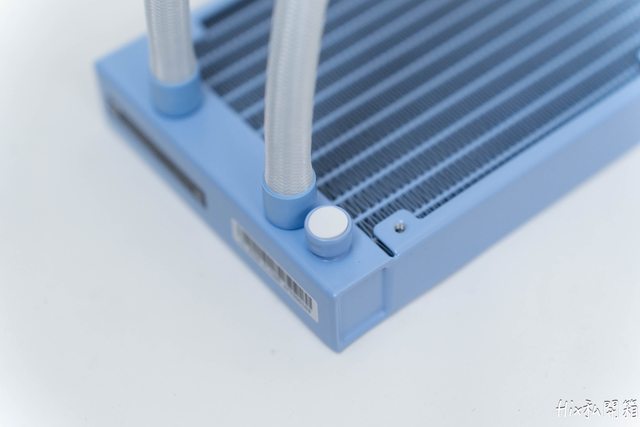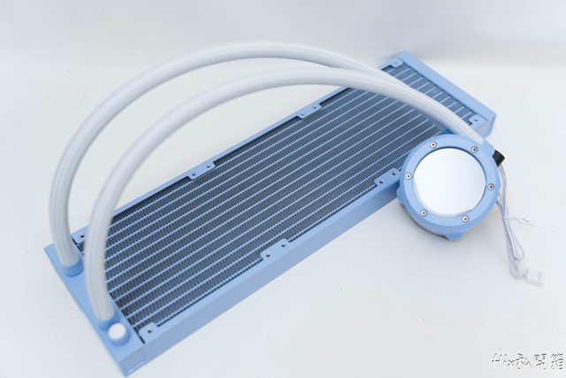 配件本身全部黑色的,冷頭及冷排則是繡球花藍