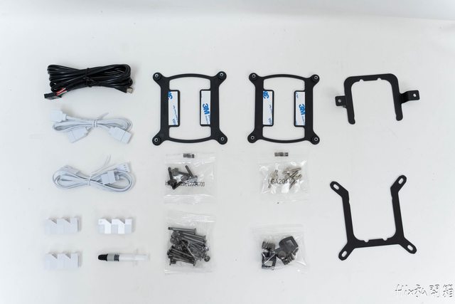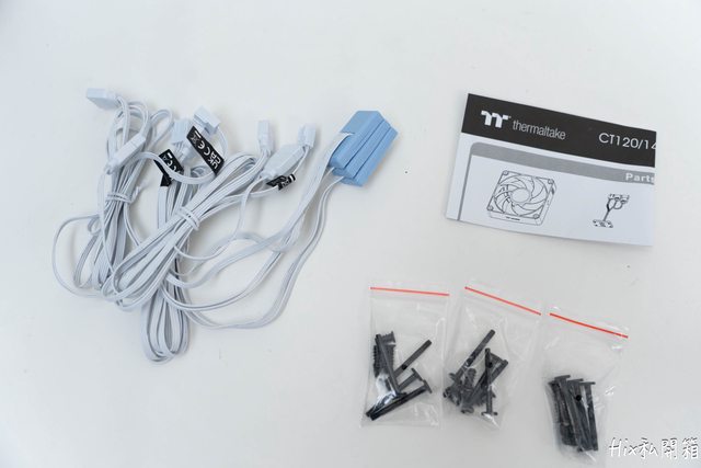 一張說明書、3條磁吸連接線以及3套風扇螺絲(包含自攻螺絲及冷排用的螺絲)
