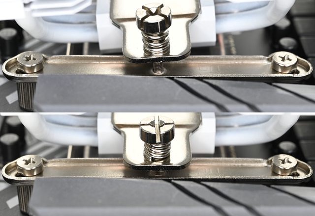 ▼LGA1200/115x托架固定柱外觀為直條紋溝槽(左),LGA1700托架固定柱外觀為斜線壓花(