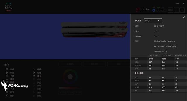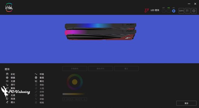 ,可以透過 Kingston FURY CTRL 軟體來設定 18+1 種預設效果,但如果是兩條搭配主板