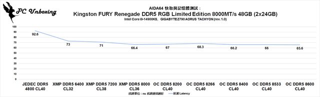 JEDEC 頻率多出 80.2 % 跟 56 % 的讀寫性能,而延遲表現最終從 92.5 ns( JEDEC 頻