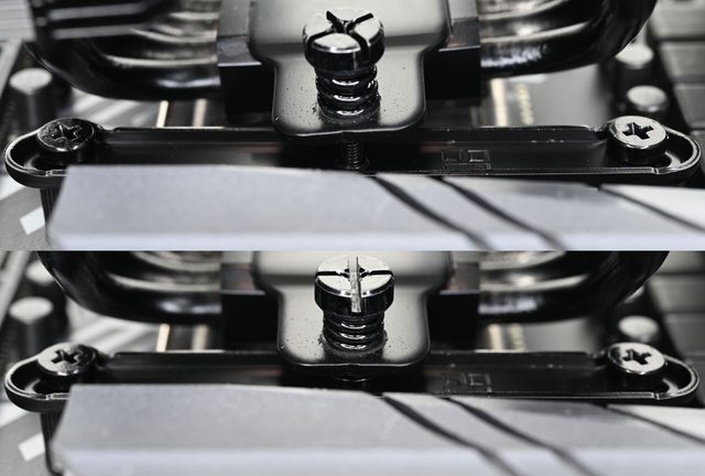 頭螺絲固定在散熱器底座頂部,壓板兩邊設置彈簧螺帽,用來鎖在托架上並提供接觸下壓