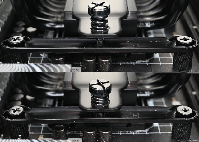 ▼LGA1200/115x托架固定柱外觀為直條紋溝槽(左),LGA1700托架固定柱外觀為斜線壓花(