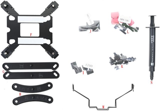 固定柱/Intel托架固定螺絲(K)、紅色AMD套管/AMD托架固定螺絲(L)、風扇固定線扣(M)、