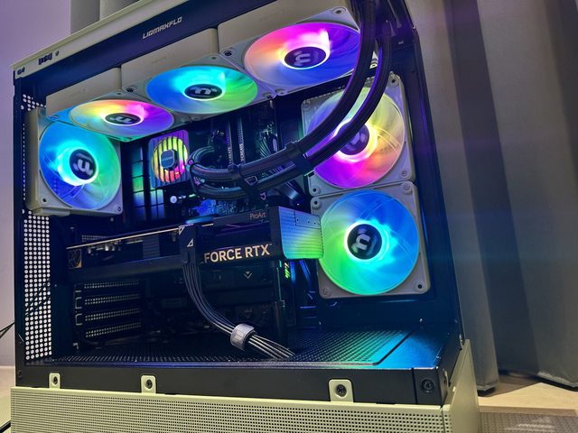 顯示卡剛好跨過側邊風扇,如側邊要搭配水冷只能使用雙風扇短卡,且建議側邊僅安裝