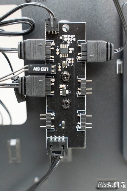 預裝好的ARGB HUB,上方已使用3個口,最多還可以再插3個RGB 3PIN接頭