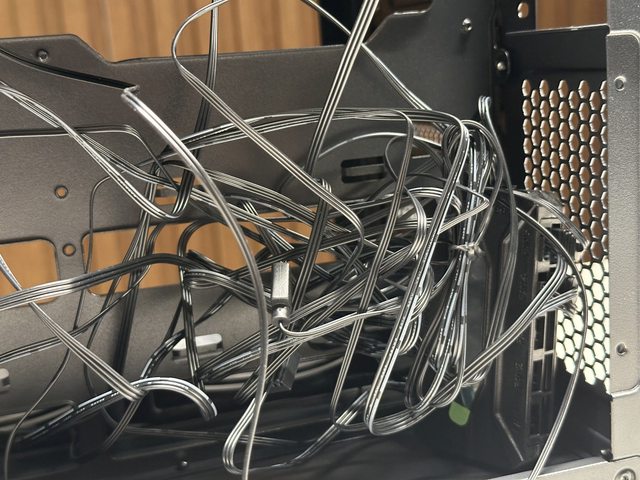 拆除硬碟架...以為來到盤絲洞了。內附7顆風扇各提供兩條單一3Pin供電及ARGB線,無分
