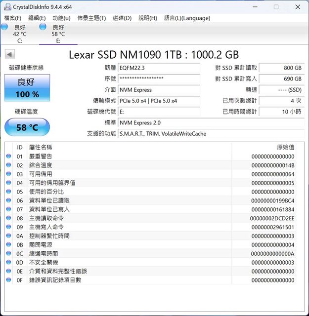 Crystal DiskMark 讀取11711MB/s寫入10635MB/s跟官方標示差不多