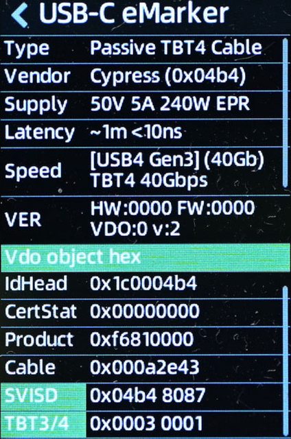 ▼E-Marker資訊內容,支援USB4 Gen3/TBT4 40Gbps資料傳輸及50V/5A 240W EPR電力傳輸