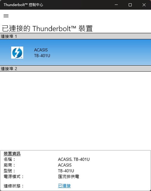 ▼Thunderbolt控制中心會顯示連接埠1已連接ACASIS TB-401U