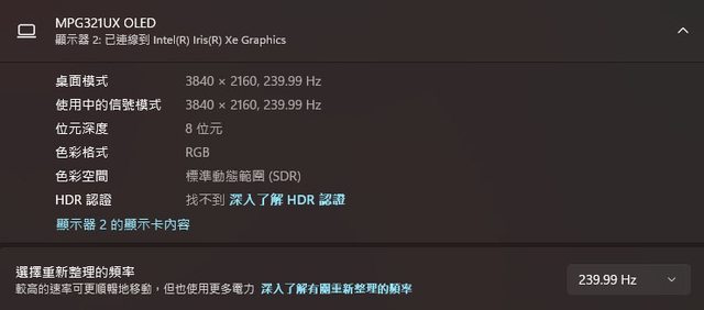 ▼進階顯示設定的顯示器內容資訊,可使用3840×2160@240Hz信號模式