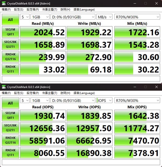 ▼CrystalDiskMark預設+R70%/W30% Mix測試