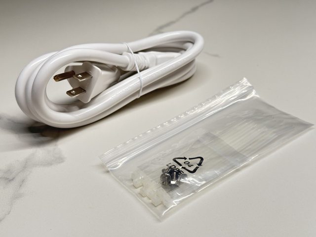 配件有一條全白品字電源線、螺絲及半透明束線帶若干。