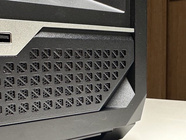 背面設有兩條長形開孔,前方為3顆風扇進氣用,後方則作為硬碟被動散熱使用。因為開