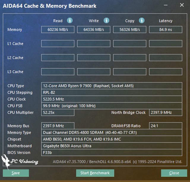 測試讀寫性能為 60236 MB/s 跟 64336 MB/s,延遲則是 84.9 ns。