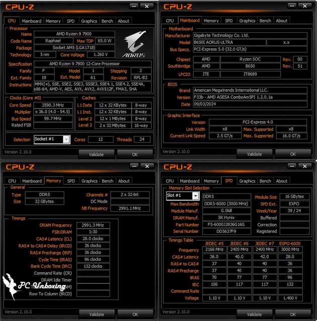 同樣由 CPU-Z 來檢視 AMD Ryzen 9 7900 與 GIGABYTE B650I AORUS ULTRA 測試平台,