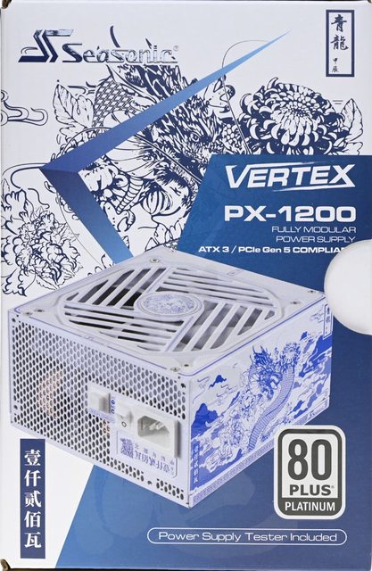▼外盒左側面有VERTEX標誌、青龍甲辰落款、Seasonic商標、PX-1200名稱、產品規格表
