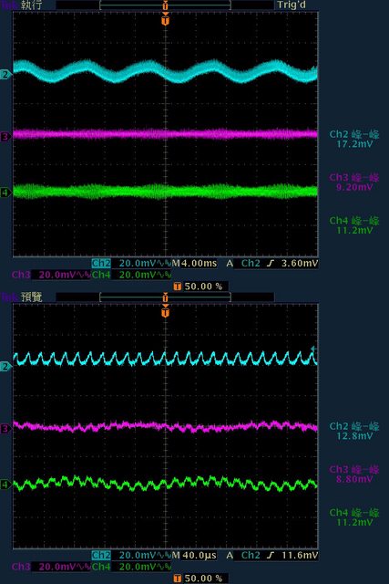 波分別為16.8mV/13.2mV/18mV,於純12V全負載輸出下12V/5V/3.3V各路低頻漣波分別為