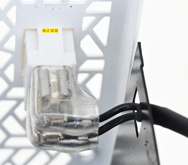 ▼直接在外殼上沖壓幾何造型開孔風扇護網,可看到內部風扇的金屬軸心,護網其中一個