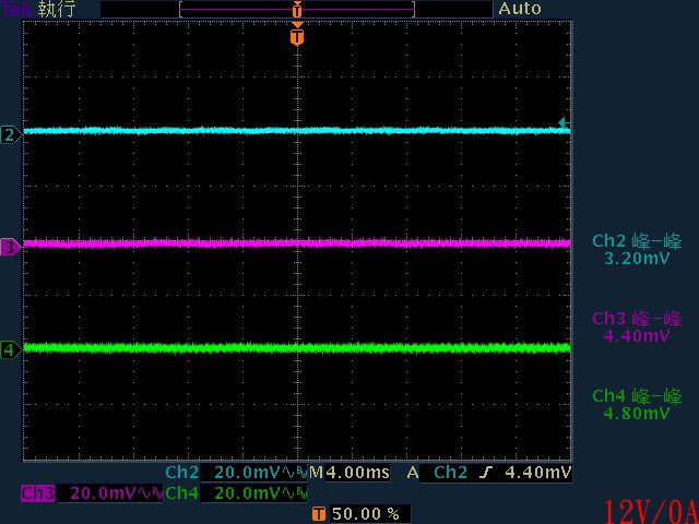 ○輸出無負載時無明顯漣波。綜合全負載輸出下12V/5V/3.3V各路低頻漣波分別為
