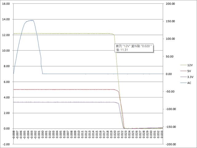 ○於3.3V/9A、5V/9A、12V/65A輸出狀態切斷AC輸入模擬電力中斷,12V於20ms降至11.31V