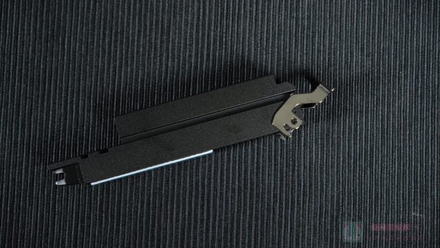 ROG 的 M.2 散熱的設計不走鰭片或多凹槽的設計,尾部銀色的拉環除了有鎖定和解除散熱