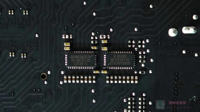 ‧ 在 PCIEX16 (G5) 下方有 2 顆 GENESYS GL9930T PCI-E 3.0 X1 中繼器。在主機板的左