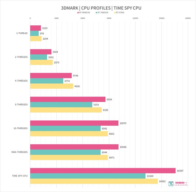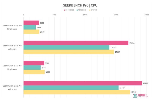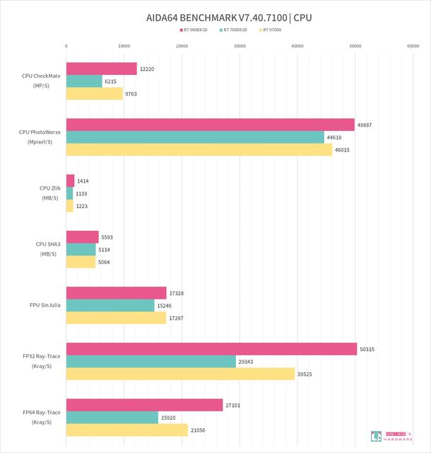 單核心和多核心對比上一代 Ryzen 7 7800X3D 提升很多,和 Ryzen 7 9700X 對比只有單核