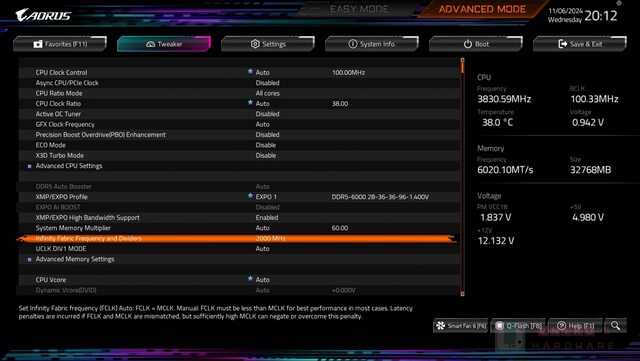 DDR5 6000 記憶體設定數值,FCLK AUTO (2000MHz)、CPU IMC UCLK 3000MHz、記憶體 MCLK