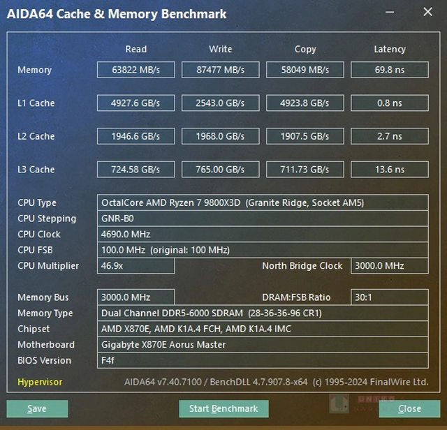AIDA 64 的處理器和記憶體快取相關資料分別為讀取 63822 MB/s、寫入 87477 MB/s、複製