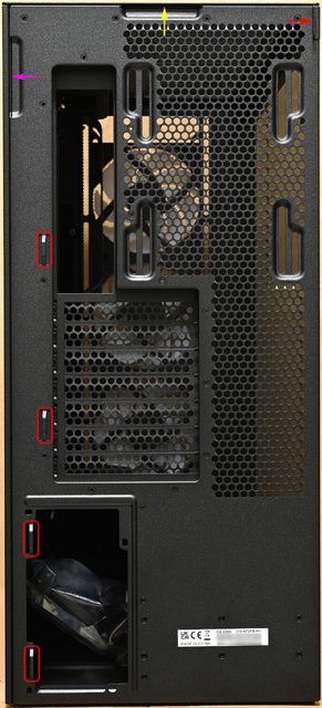 ▼後方最上面有打開左側板(紅色箭頭)、頂部網孔板(黃色箭頭)及右側板(紫色箭頭)的施
