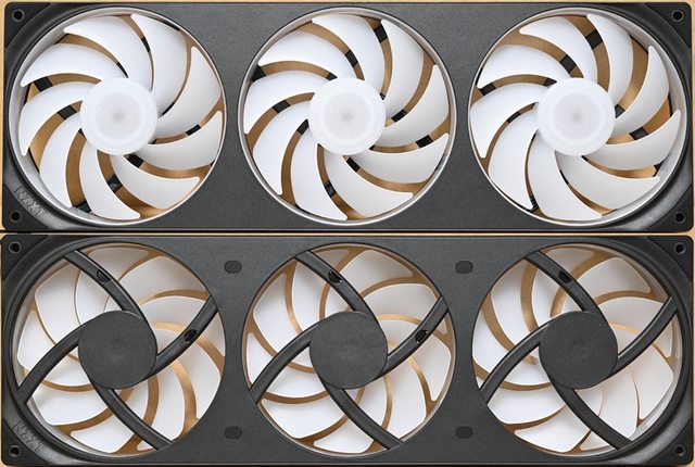 葉片乳白色扇葉,扇葉開口有乳白色光環,框體4個角落的螺絲孔均配置防震墊,其中一