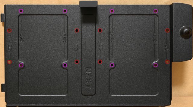 ▼3.5吋/2.5吋活動固定板上的3.5吋裝置固定孔(紅框)及2.5吋裝置固定孔(紫框)