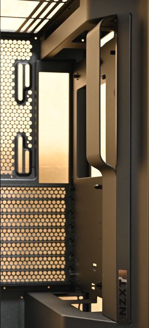 ▼前方網孔板使用卡榫固定,免用工具即可拆卸,前方可拆式風扇/水冷排固定架的左上/