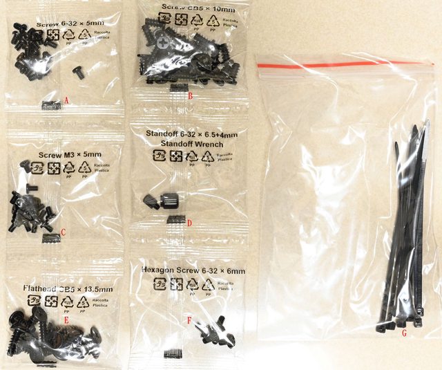 機板銅柱/銅柱套筒工具(D)、底部風扇專用長螺絲(E)、電源螺絲(F)、塑膠束帶(G)