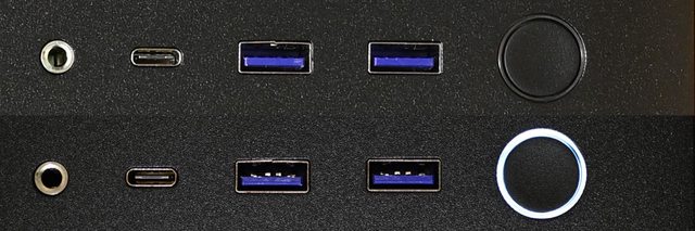 ▼頂部右前方由前(圖右)至後(圖左)分別是電源按鈕/指示燈、2個USB3.2 Type-A、