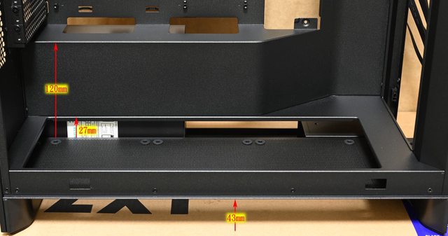 ▼左側下方通風口提高43mm,安裝風扇的長方形開口深度27mm,從通風口到最下方擴充槽