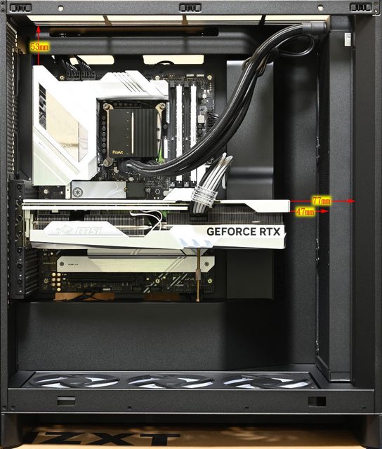 端距離前方風扇架77mm,顯示卡前端距離水冷排47mm。主機板後方I/O埠裝飾蓋距離頂部