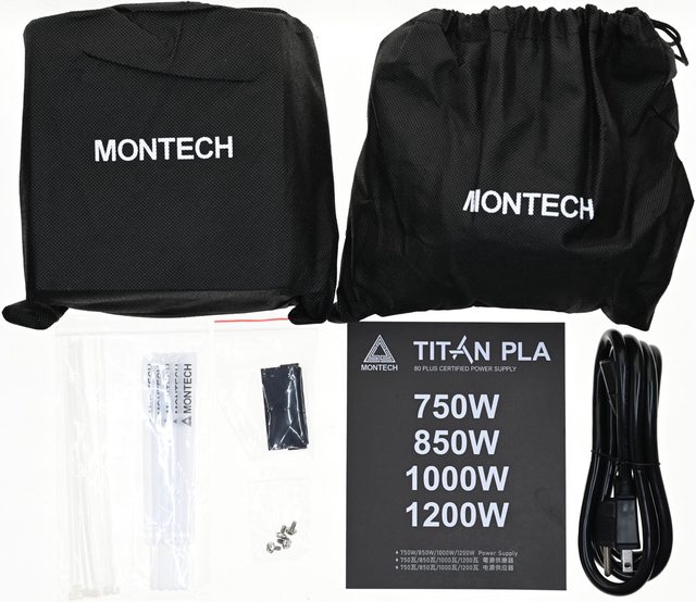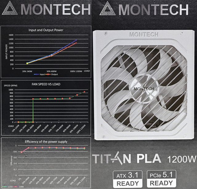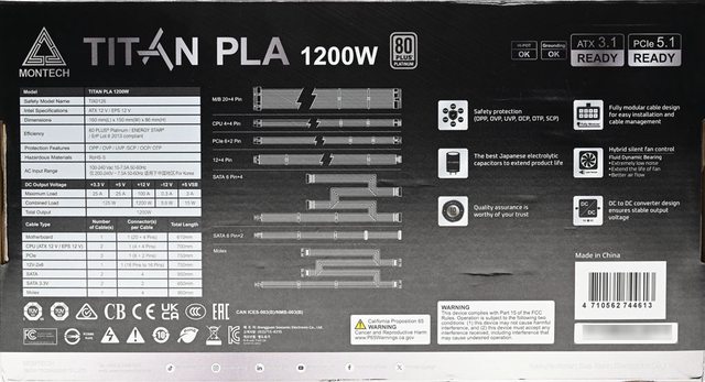 ▼外盒背面有MONTECH商標、TITAN PLA名稱、輸出功率、80PLUS白金認證、ATX 3.1 /