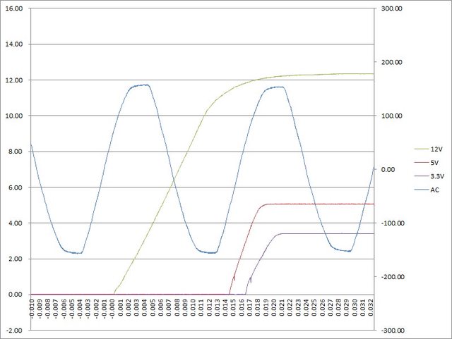 從12V開始上升處當成起點(0.000s)時,12V上升時間28ms,5V上升時間5ms,3.3V上升時